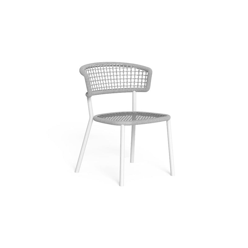 Together with the dining table it creates a soft and elegant atmosphere. Structure in aluminium covered with a braiding of ropes in grey synthetic fabric.